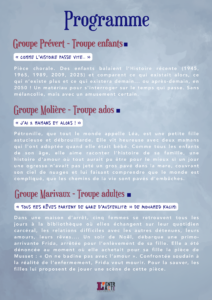 Le mardi 24/03, une soirée d’improvisation sera proposée avant le spectacle adulte (les troupes partenaires seront communiquées ultérieurement)